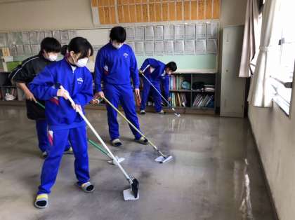 本日3限目に大掃除をしました。生徒たちは「お世話になりました!」と感謝しながら、教室や廊下、トイレなどをピカピカに仕上げました。いつもよりも念入りに気持ちを込めることができました。また、掃除後には環境整美委員を中心に教室のワックスがけも行いました。きれいになりました。ありがとう。