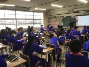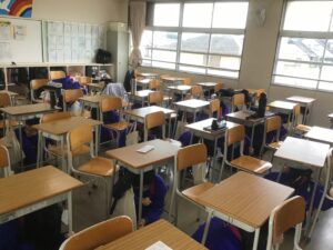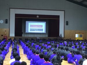 「自分の命は自分で守る ~助けられる人から助ける人へ~」というテーマでお話していただきました。「大きな地震が起きたら、電気水道は一切使えなくなる。救急車や消防車、自衛隊などもすぐには来てくれません。助けに行きたくても助けに行けないのです。だからこそ、自分の命は自分で守ってください。そして、助けられる人から、助ける人になってください。」とお話されていました。そして、実際避難所運営をしてみて困ったことなどを聞かせていただきました。そのお話をふまえて、6限目は実際に避難所で起こりうる想定について、自分事として考える学習をしました。