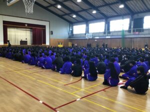 生徒指導の先生からは公共の場でのマナーについて話があり、「周りのことに気づける人、周りに感謝される人になってください。」と伝えてもらいました。また、目標を持って、何かに挑戦することの大切さについて話がありました。