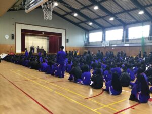 生徒指導の先生からは公共の場でのマナーについて話があり、「周りのことに気づける人、周りに感謝される人になってください。」と伝えてもらいました。また、目標を持って、何かに挑戦することの大切さについて話がありました。