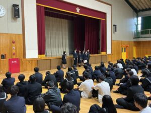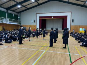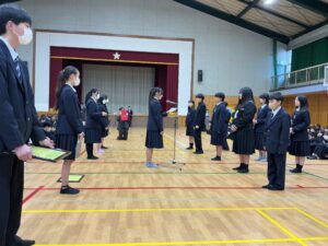 昨年度の後期生徒会役員からバトンを受け取り堂々と意気込みを語りました。生徒会を中心に全生徒の皆さんが一人一人主役になれるように積極的にチャレンジをしていきましょう。