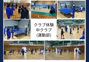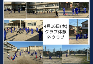 本日4/16(木)はクラブ体験を行いました。2、3年生や顧問の先生からたくさんのことを教えてもらいました。生徒からは「楽しかった」「難しいけどできるようになりたい」「私はこの部活に入りたいので早く上手くなりたい」など前向きな言葉を聞くことができました。